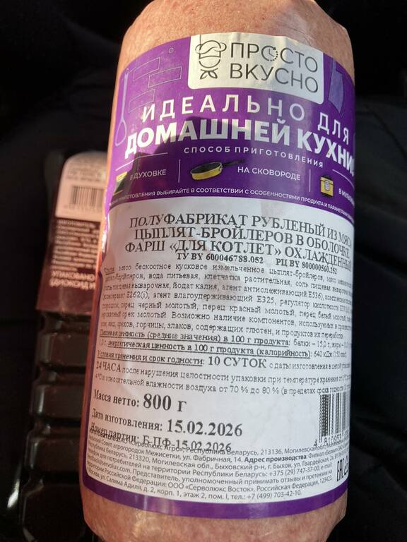 Государственным санитарным надзором Хойникского района выявлена продукция, не соответствующая требованиям законодательства в области санитарно-эпидемиологического благополучия населения: «Полуфабрикат рубленый из мяса цыплят-бройлеров в оболочке «Фарш «Для котлет» охлажденный», дата изготовления: 15.02.2026, срок годности 10 суток, изготовитель: ЗАО «Серволюкс Агро», Республика Беларусь, Могилевская область, Могилевский район, Дашковский сельский Совет, агрогородок Межисетки, ул. Фабричная, 14».